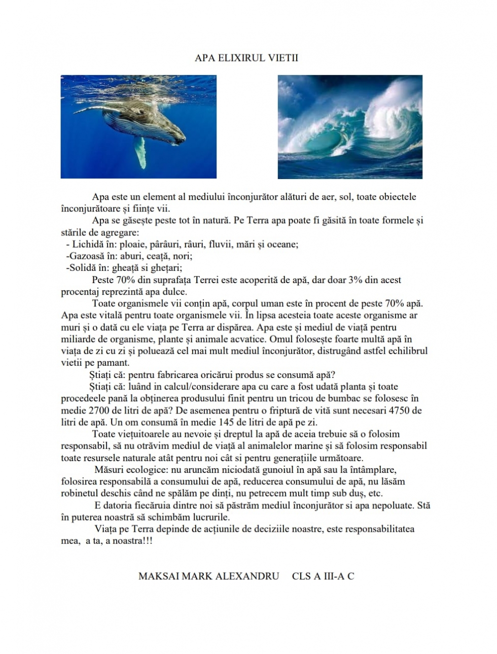 Îndemnul la păstrarea calități apelor și evitarea poluării precum și grija față de apă și economisirea ei, arată preocupările copiilor față de rolul pe care apa îl are în viața fiecaruia.